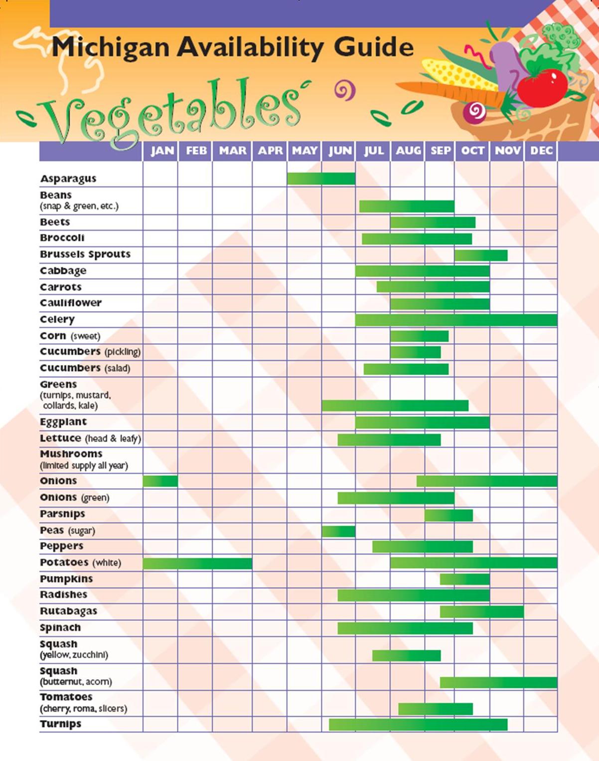 Check out the Michigan Availability Guide (click to enlarge) to see what is most likely available at our farmers market.